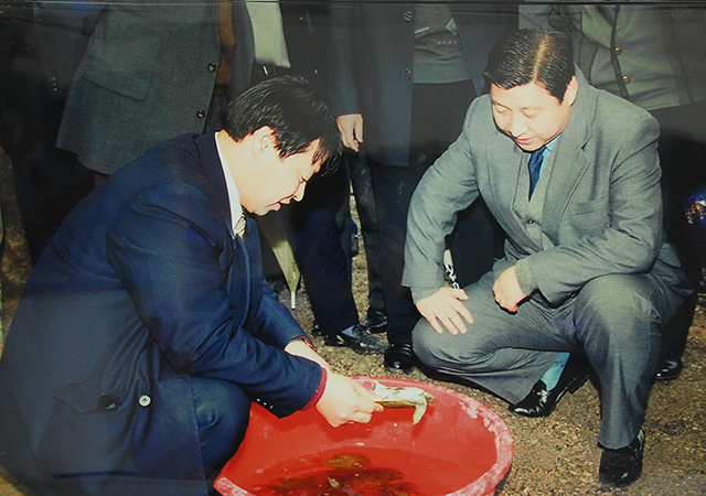(1999年3月15日,習(xí)近平同志第二次到圣農(nóng)調(diào)研,當(dāng)時圣農(nóng)除養(yǎng)雞外,還養(yǎng)有部分甲魚。)