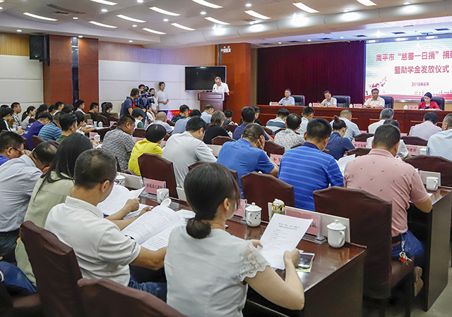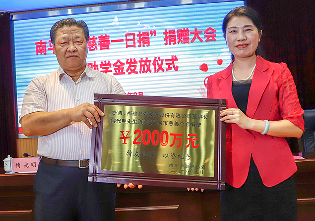 8月16日,南平市“慈善一日捐”捐贈大會暨助學(xué)金發(fā)放儀式在延平舉辦,市委常委、統(tǒng)戰(zhàn)部長莊莉,市慈善總會會長、福建圣農(nóng)發(fā)展股份有限公司董事長傅光明出席活動。