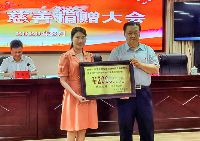8月20日,南平市慈善捐贈大會在建陽舉辦,市委常委、統(tǒng)戰(zhàn)部長莊莉,副市長羅恩平,南平市工商聯(lián)主席、慈善總會會長、圣農(nóng)集團(tuán)創(chuàng)始人傅光明出席會議。