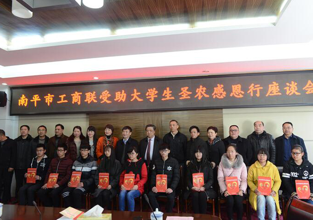 2月15日,南平市工商聯(lián)受助大學(xué)生圣農(nóng)感恩行活動在圣農(nóng)集團(tuán)總部舉行。市工商聯(lián)主席、福建圣農(nóng)發(fā)展股份有限公司董事長傅光明向閩北十縣(市、區(qū))的10名貧困大學(xué)生發(fā)放2萬元助學(xué)金和1千元新年紅包。